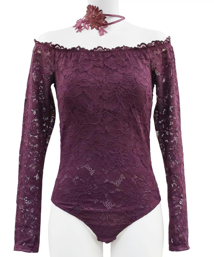 Harmony in Bloom チョーカー付きオフショルレースボディスーツ/テディ【Dark Purple】